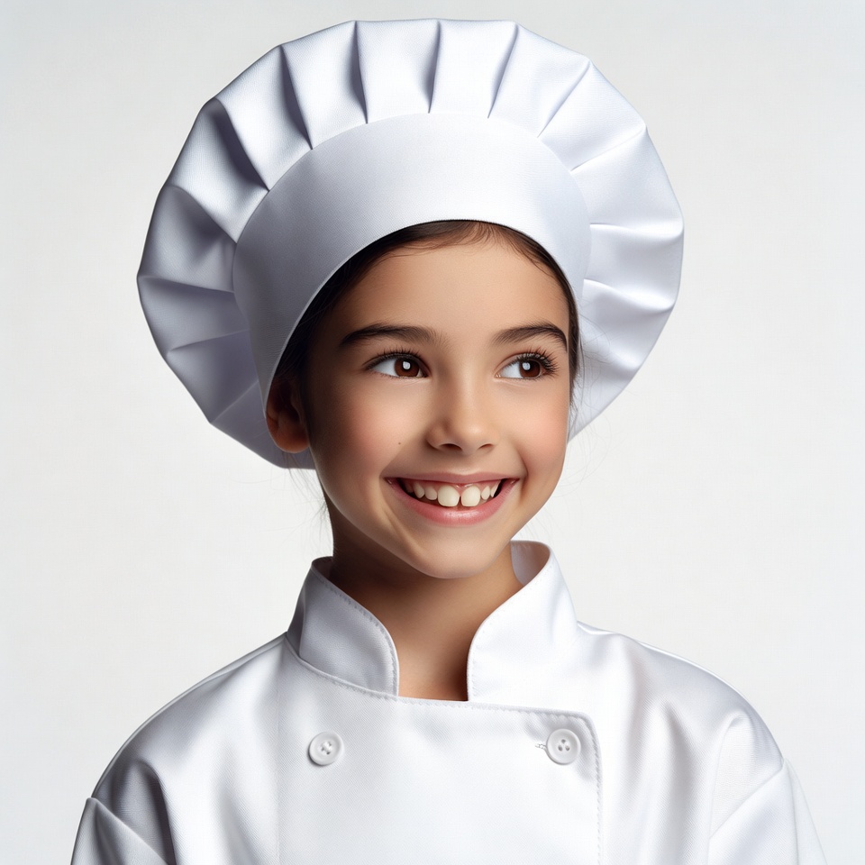 A young girl with dark hair smiles happily while wearing a tall white chef's hat and matching chef uniform. She stands against a plain white background with her head slightly tilted. Her eyes are expressive and she shows her teeth in a bright smile.