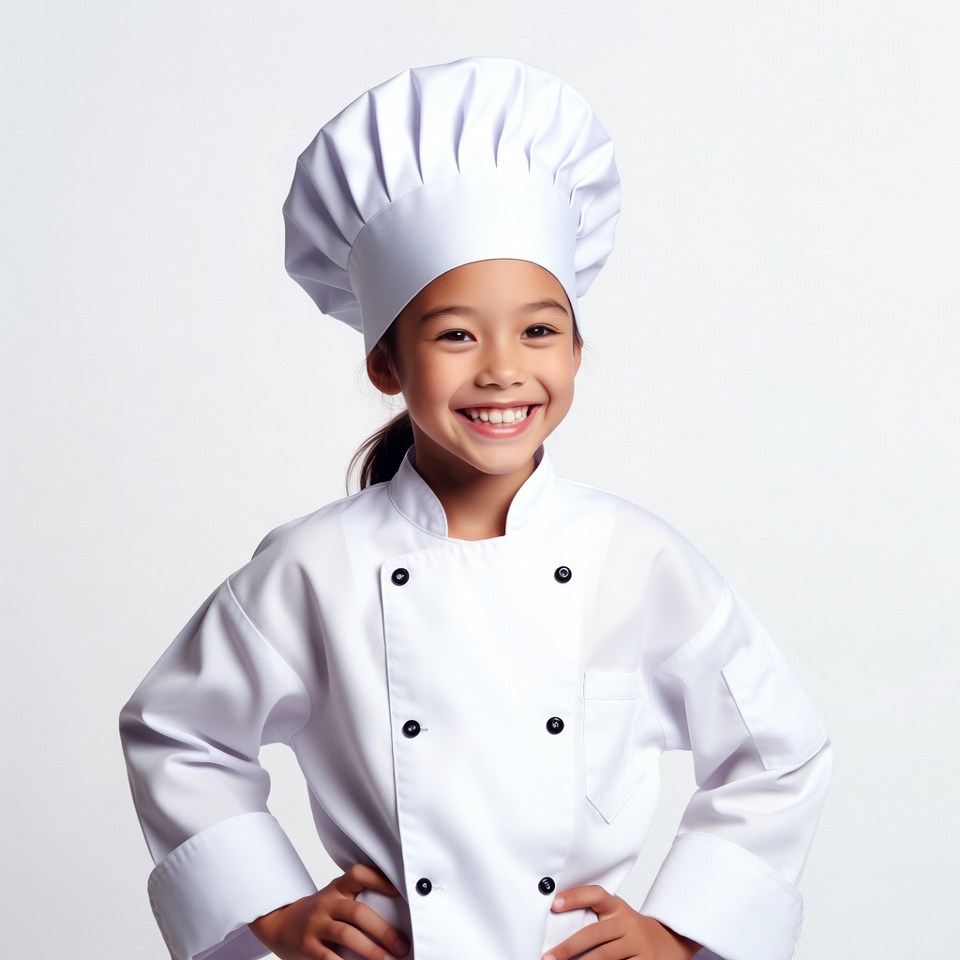 A young Asian girl with smiling face and ponytail wears a white chef hat and uniform. She stands confidently with hands on hips against a plain white background. Her chef jacket features double-breasted buttons.