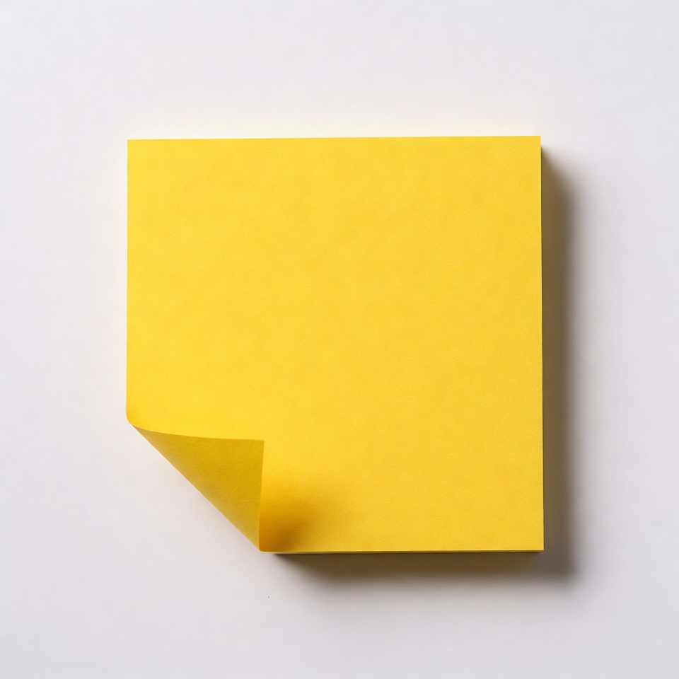 A bright yellow Post-it note is positioned on a plain white background. The note features a curled corner, giving it a slightly lifted appearance. It is blank and square-shaped, isolated for clear visibility.