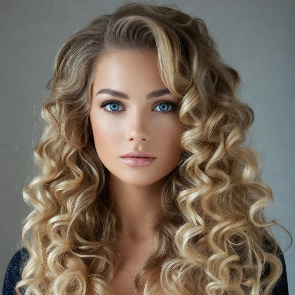 A young woman with long, voluminous blonde curly hair gazes directly at the camera. She has striking blue eyes, full lips, and flawless makeup on her fair skin. The portrait is set against a plain gray background.