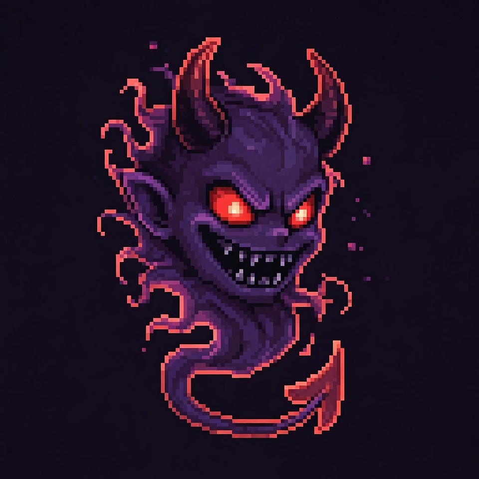 A menacing purple demon head rendered in pixel art style with glowing red eyes and sharp fangs. Curved horns protrude from its head, surrounded by swirling dark purple smoke effects. A thin tail extends from the bottom on an isolated black background.