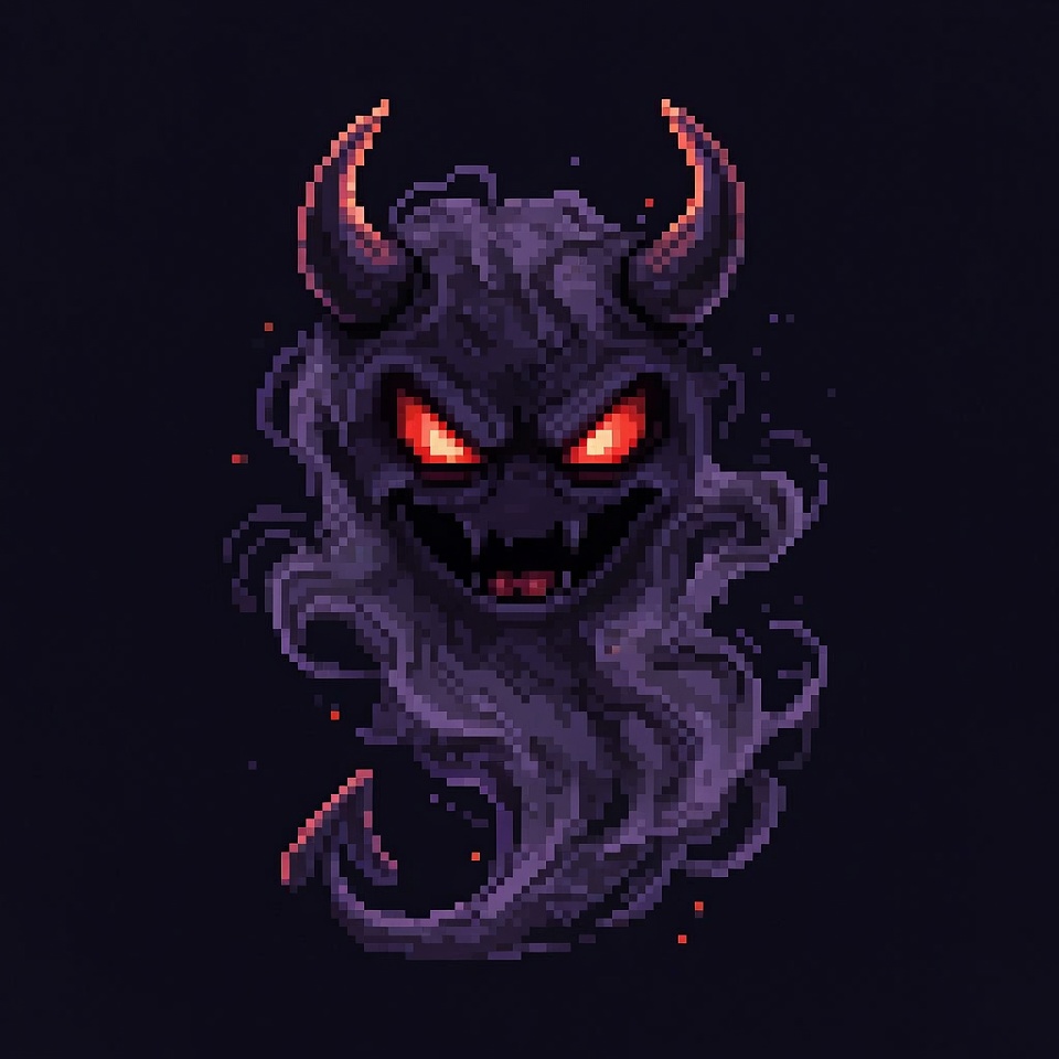 A menacing demon face rendered in pixel art style features curved horns, glowing red eyes, and sharp fangs. Dark smoky wisps surround the black face with fiery red highlights on a black background. The illustration has a retro video game aesthetic.