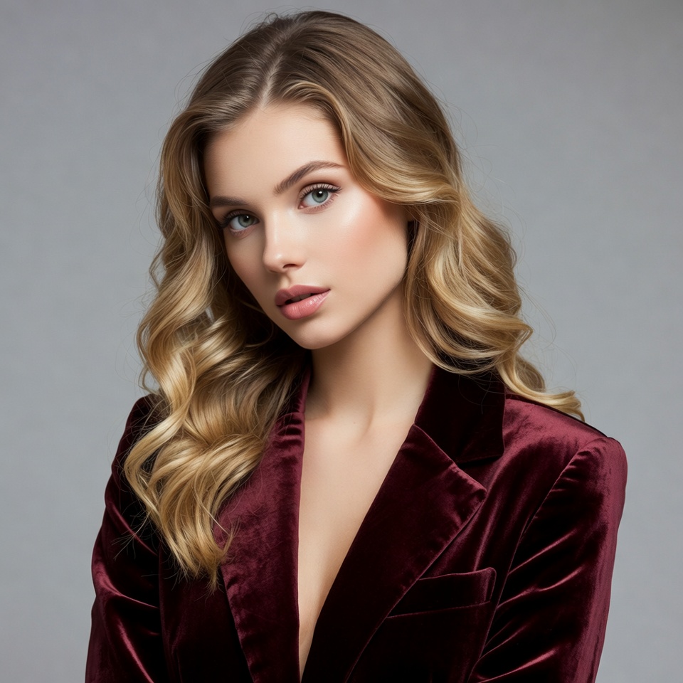 A young woman with long wavy blonde hair gazes at the camera with blue eyes and subtle makeup. She wears a deep red velvet blazer with a deep V-neckline over a gray background. Her expression is soft and alluring with glossy lips.