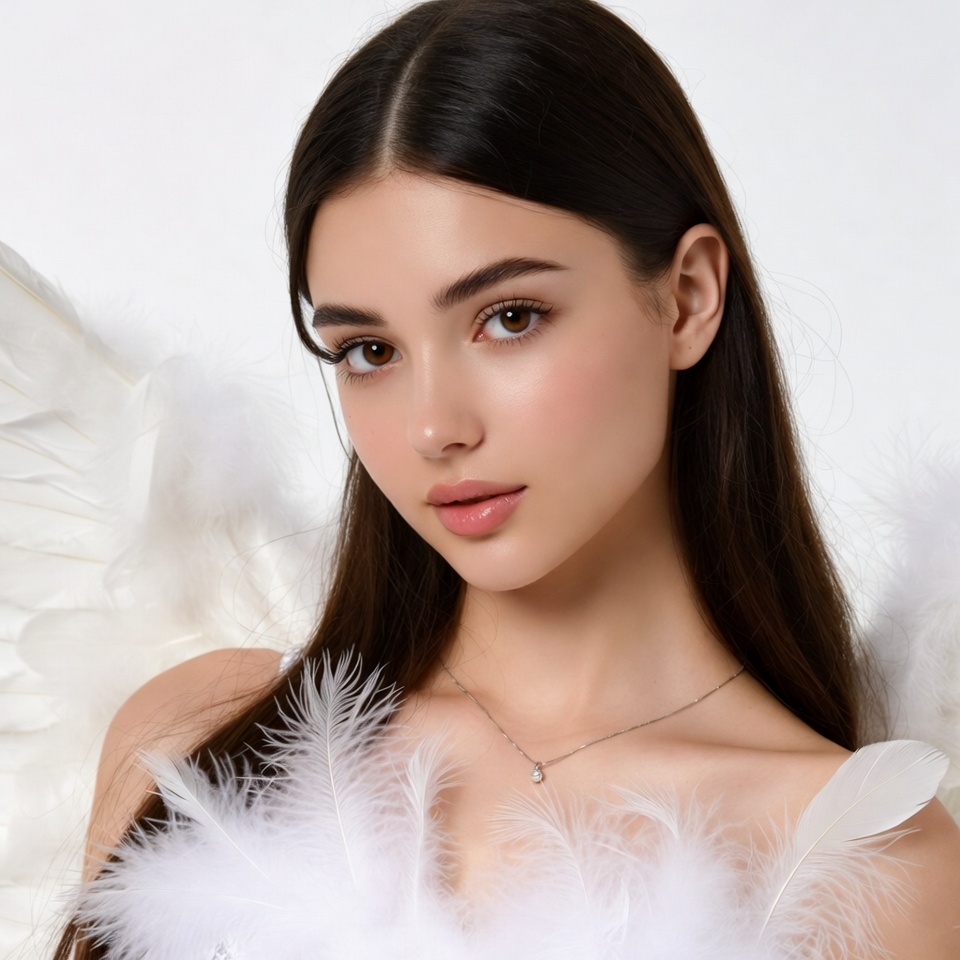 A young woman with long straight black hair and subtle makeup gazes at the viewer. She wears a delicate necklace and large white feathered angel wings positioned around her shoulders. The image features a plain white background with feathers scattered around.