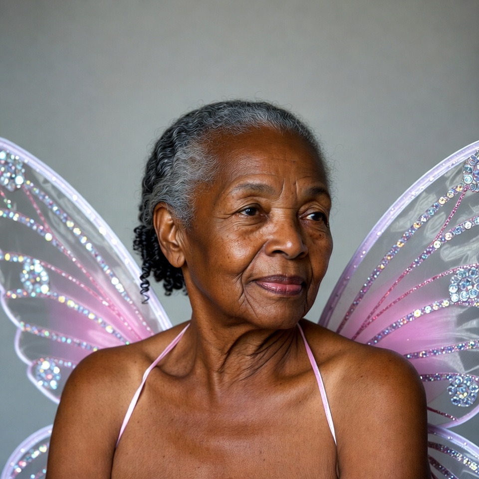An elderly African-American woman with gray braided hair smiles gently at the camera. She wears large sparkling pink fairy wings and a pink strapless top. She stands against a plain gray background.