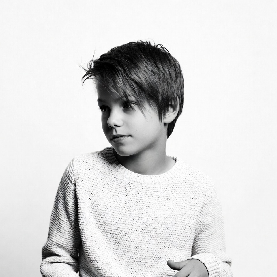 A young boy with short tousled hair gazes to the side in a black and white portrait. He wears a textured knit sweater and stands against a plain white background. His expression is thoughtful with soft lighting highlighting his face.