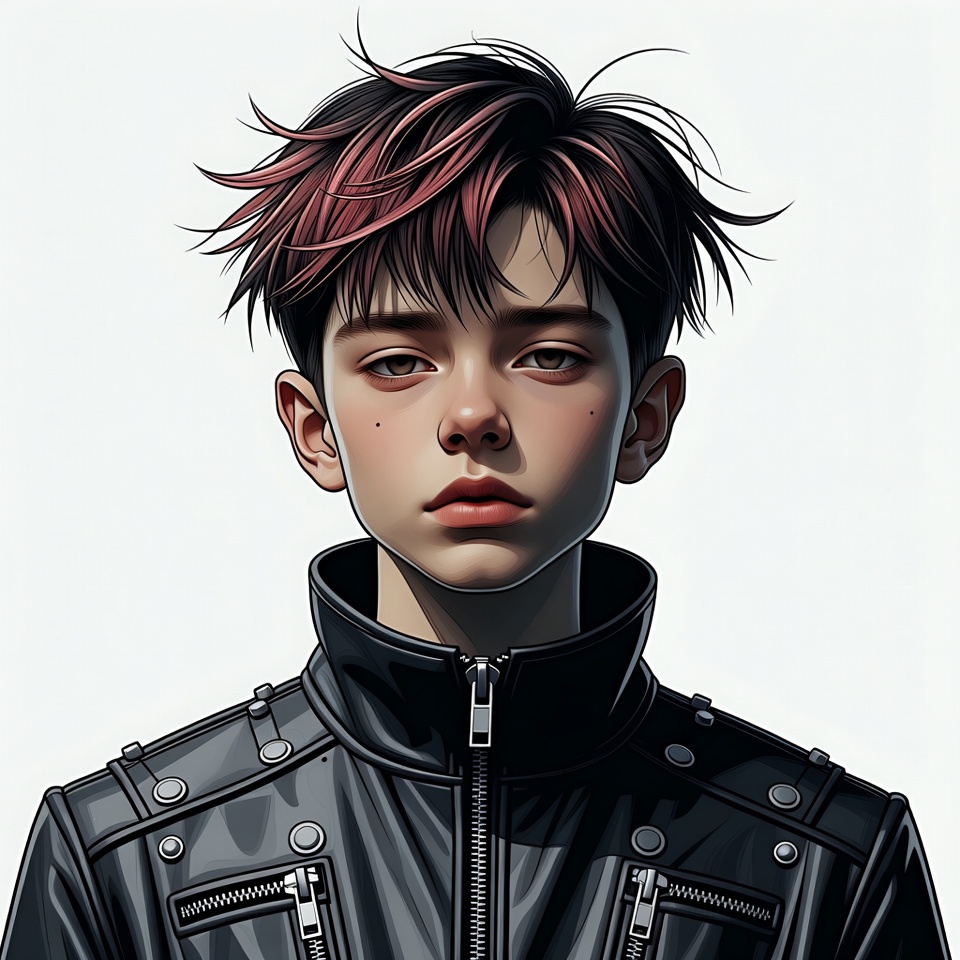 A young Asian boy with messy pinkish-red hair and expressive eyes stares forward in a detailed digital illustration. He wears a shiny black leather jacket with silver studs and a high collar. The portrait is set against a plain white background.
