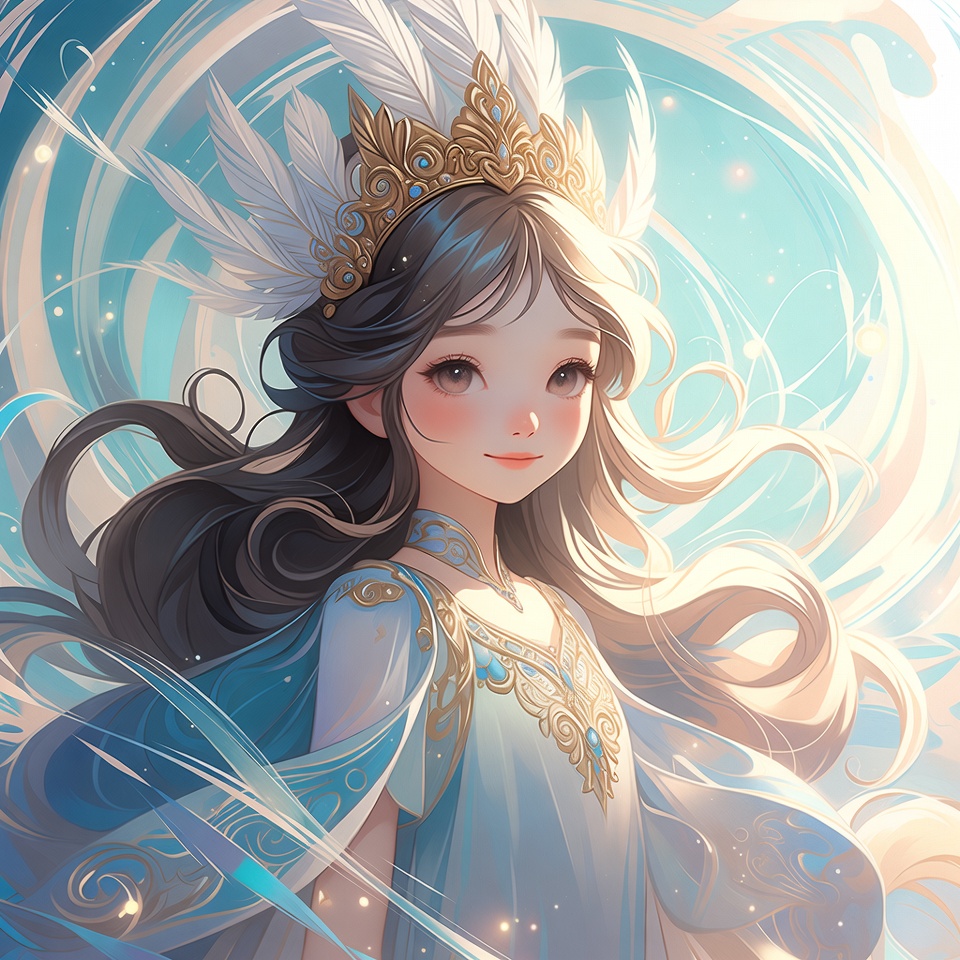 A beautiful anime girl with long dark hair wears an ornate golden crown adorned with white feathers. She dons a flowing blue and gold traditional dress with intricate embroidery. She smiles gently against a glowing blue background with swirling light effects.