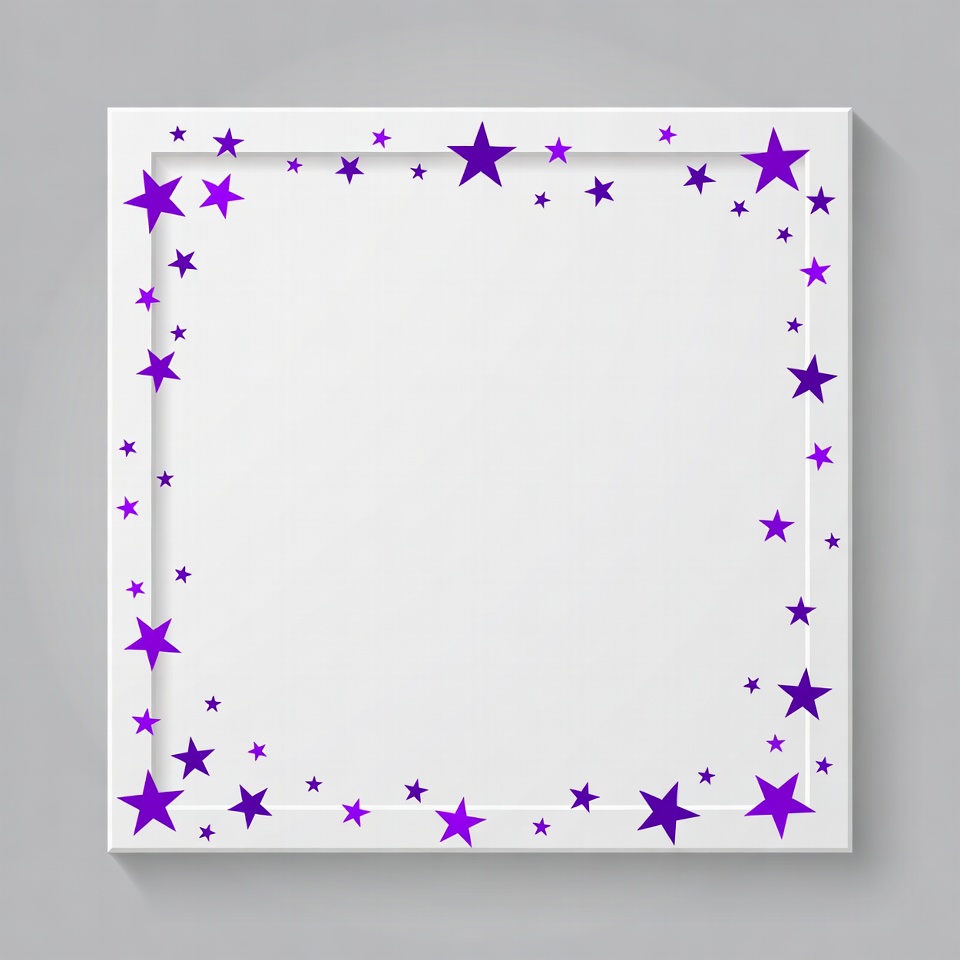 A square white frame features a decorative border of bright purple stars. The interior of the frame is empty against a light gray background. The stars are evenly spaced around all four edges.