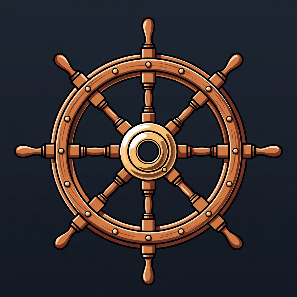 A detailed cartoon illustration of a traditional wooden ship's steering wheel with eight spokes and brass fittings. The wheel features ornate wooden handles and a central brass hub, set against a solid dark blue background. It is depicted in a classic nautical style with clean lines and vibrant colors.