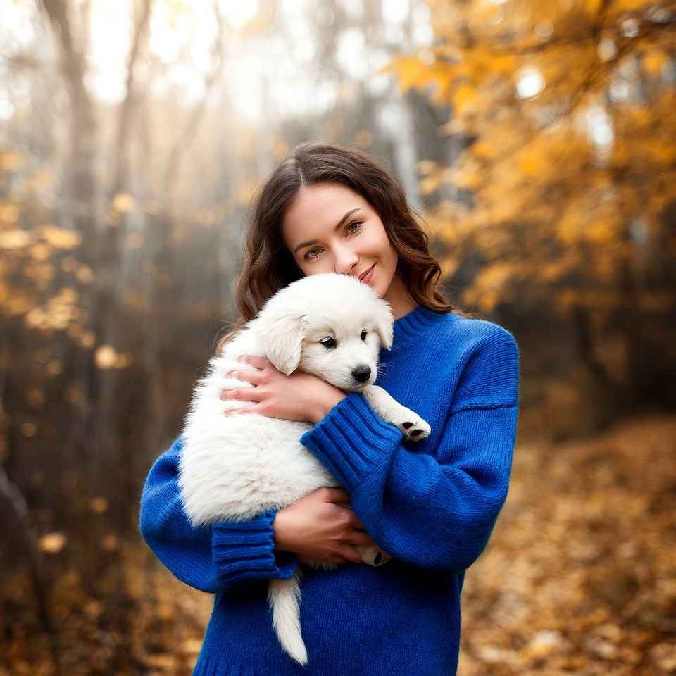 A young woman with long brown hair smiles while holding a fluffy white puppy in her arms. She wears a blue sweater and stands in a forest with yellow autumn leaves and trees in the background. The puppy looks up at her with bright eyes.