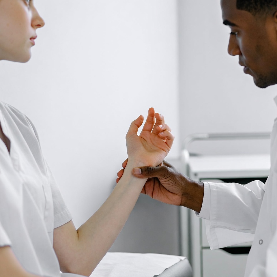 Black male, White female, arm, clinic, consultation, exam room, hand, healthcare, hospital, isolated background, medical checkup, medical examination, nurse, patient, physician, professional, scrubs, white coat, woman, wrist exam, doctor