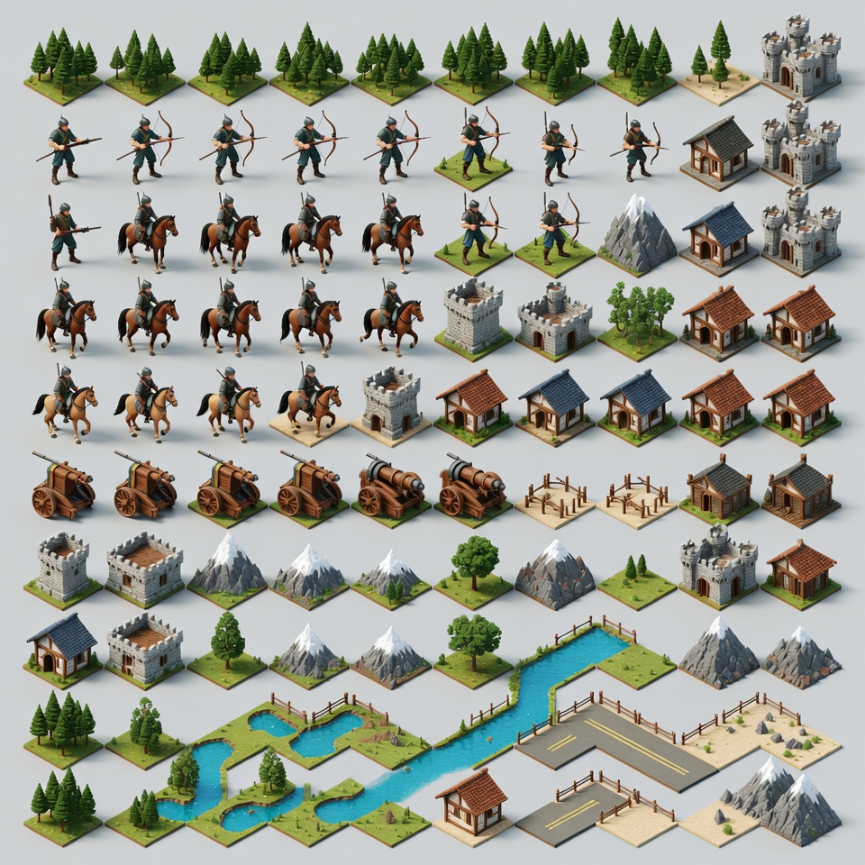 3D graphics, archers, buildings, cannons, clipart, fantasy tileset, fences, game assets, gray background, horses, houses, illustration, isolated background, knights, landscape elements, medieval castle, mountains, nature scenery, rivers, roads, soldiers, terrain tiles, towers, trees, isometric tiles