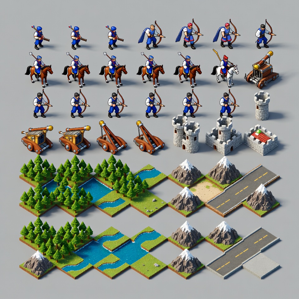 archers, army, battlefield, castle walls, catapults, cavalry, clipart, forest, game assets, horses, illustration, isolated background, medieval soldiers, mountains, river, road, siege towers, swordsmen, trees, troops, isometric tileset