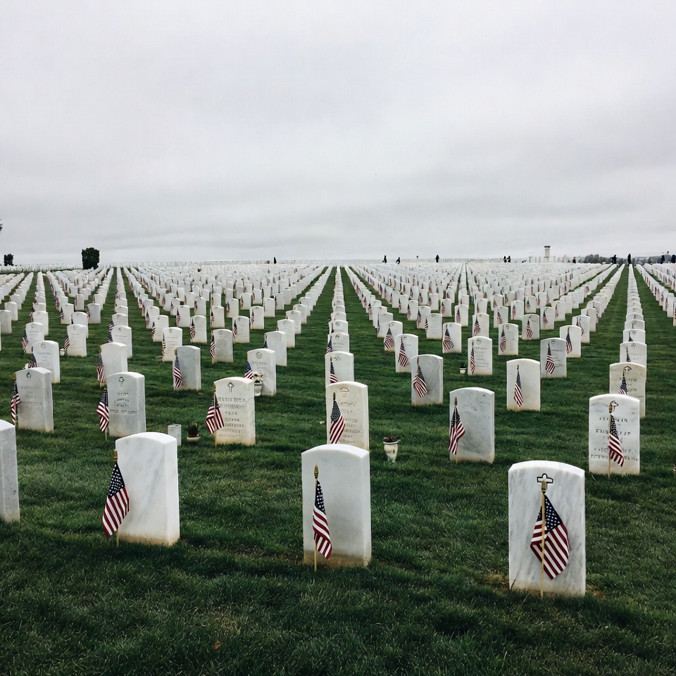 Rows of white gravestones covered in American flags stretch across a grassy cemetery under a cloudy sky. Each headstone features a small U.S. flag planted in the ground. The scene shows a vast memorial field with orderly lines of graves.