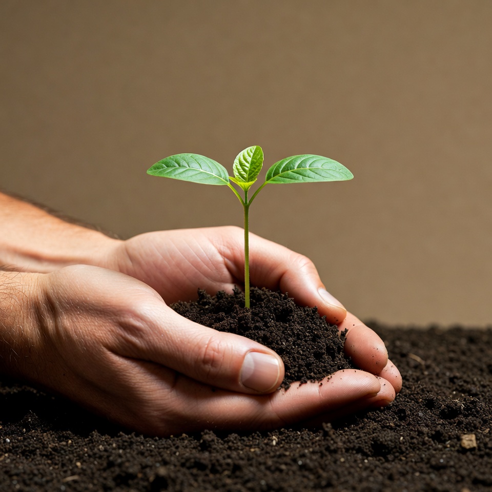 A pair of male hands cradles a small green sprout emerging from dark soil. The sprout features three tender leaves and a thin stem. The background is a neutral brown, emphasizing the plant and hands.