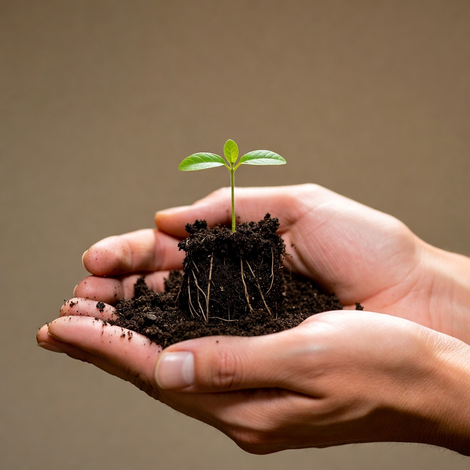 A pair of hands cradles a small green seedling emerging from a soil mound with visible roots. The plant features tender green leaves atop a thin stem. The background is a neutral brown, emphasizing the hands and plant.