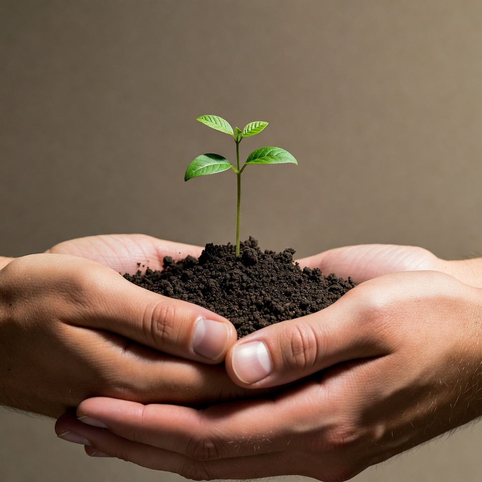 Two hands cup a small mound of dark soil containing a fresh green sprout with tender leaves. The plant emerges from the center of the soil, held securely by male hands with visible skin texture and nails. The background is a plain neutral tan, isolating the subject.