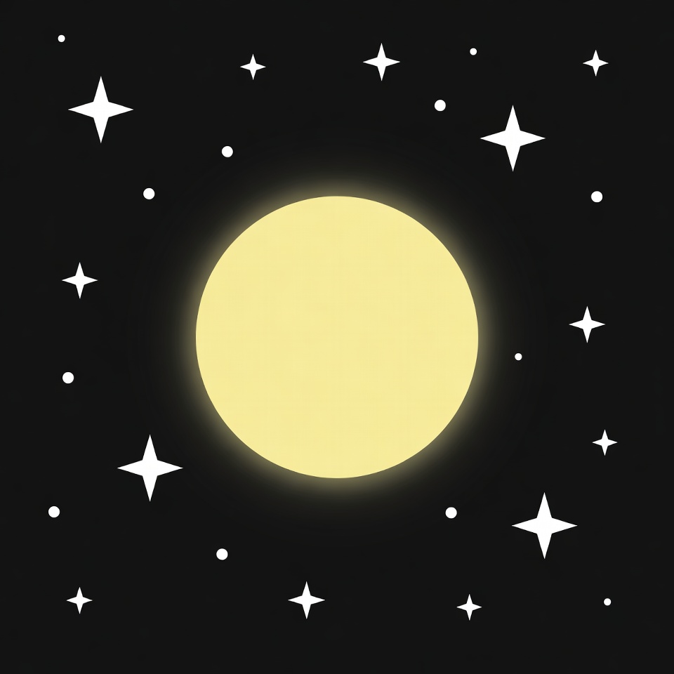 A glowing yellow full moon is centered against a black night sky. Numerous white stars are scattered around the moon, creating a starry background. The image features a simple, illustrative style with a flat design.