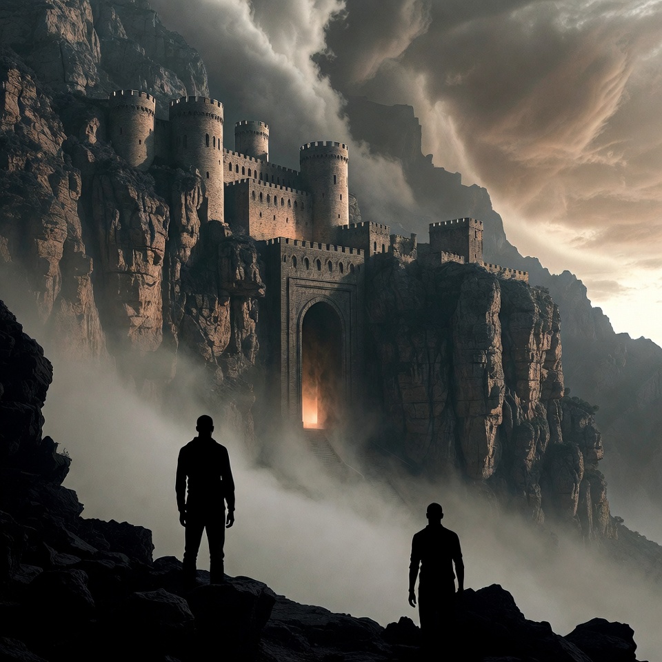 ancient fortress, arched entrance, back view, battlements, cliffs, dark clouds, dramatic sky, fantasy landscape, fiery light, fog, glowing gate, male, medieval castle, men, mist, mountains, rocky terrain, silhouettes, stone castle, storm clouds, towers, two men, castle