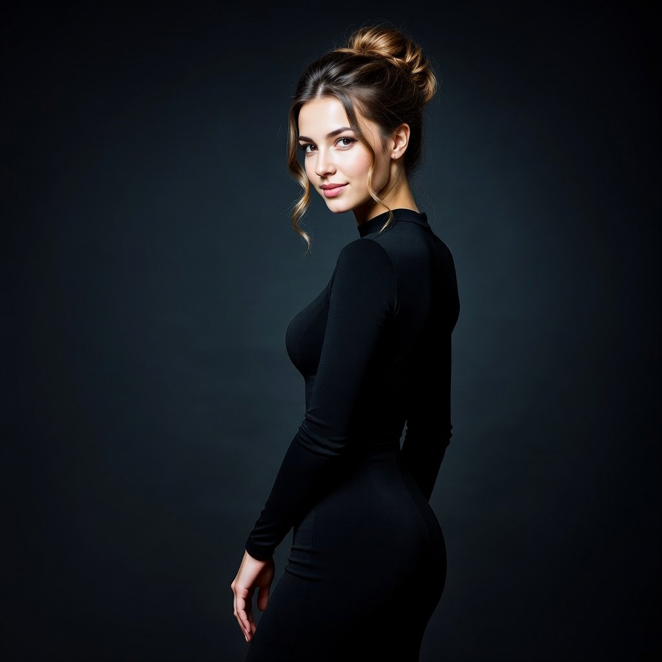 A young woman with brunette hair styled in an updo stands in profile against a dark background. She wears a form-fitting black turtleneck dress that accentuates her curves. She glances over her shoulder with a subtle smile.