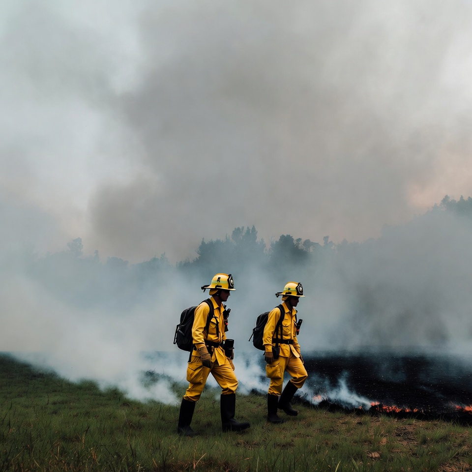 Two firefighters in yellow protective suits and helmets walk side by side through a grassy area amid thick smoke from a wildfire. They carry backpacks and gear while navigating burning ground and hazy forest background. Smoke and flames are visible in the surrounding environment.