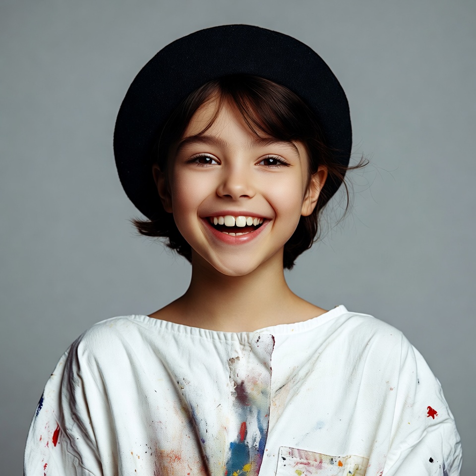A young girl with short brown hair and bright smile wears a black beret hat. She has on a white shirt splattered with colorful paint. She poses against a plain gray background.