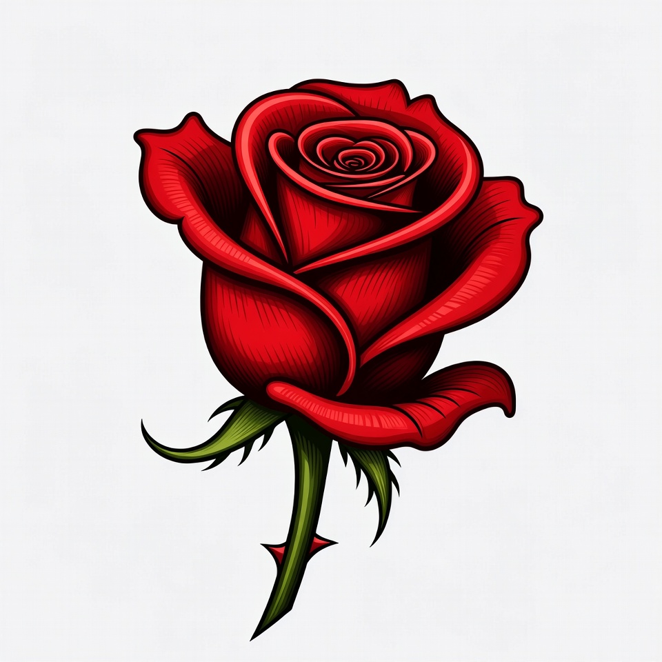 A vibrant red rose illustration features detailed petals and a green stem with thorns. The flower stands alone against a white background. Bold outlines and shading give it a striking, artistic appearance.