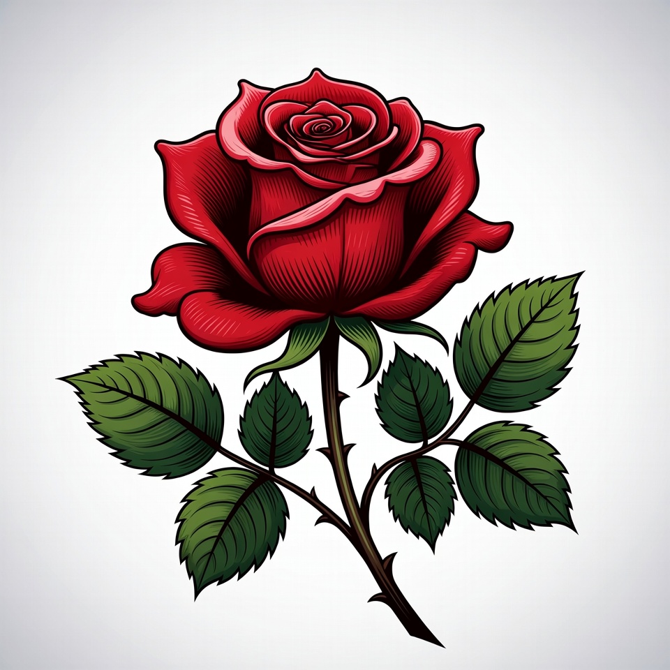 Red Rose Illustration with Leaves