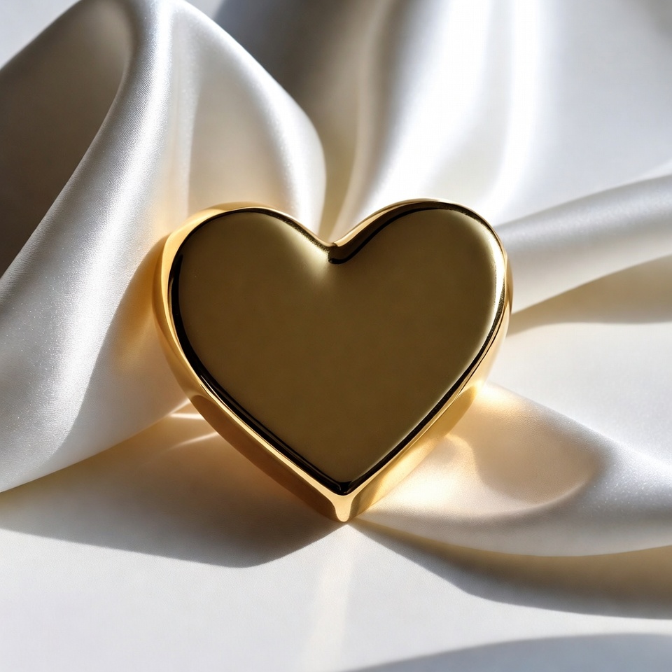 closeup, draped silk, elegant decor, fabric texture, gold object, golden, heart, isolated background, jewelry, love symbol, luxury fabric, metallic heart, reflective surface, satin fabric, shiny heart, silk fabric, still life, valentine, white silk, gold heart
