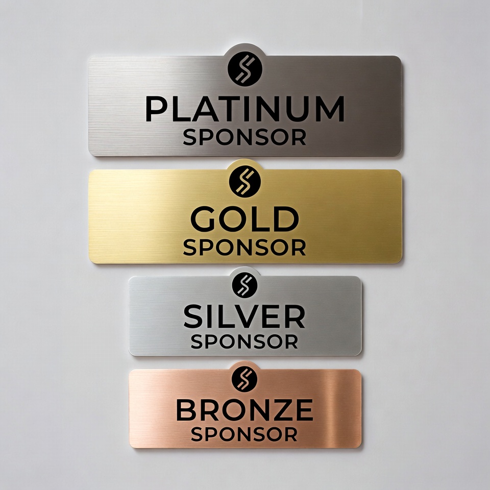 Four metallic sponsor badges are arranged vertically on a white background. They feature platinum, gold, silver, and bronze finishes with bold sponsor labels and matching icons. Each badge has a sleek, nameplate-style design.