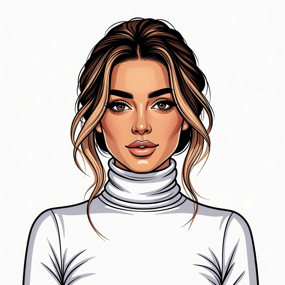A digital illustration of a young woman with long wavy brown hair highlighted with blonde streaks, styled in a loose updo. She has striking almond-shaped eyes with thick lashes and full lips, wearing a white high-neck turtleneck sweater. The portrait is set against a plain white background.