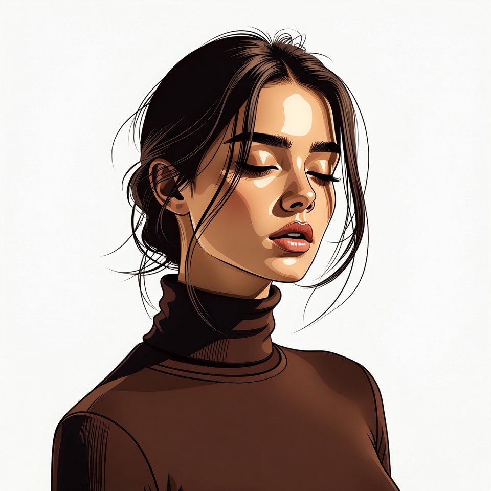 White, artistic portrait, beautiful, brown hair, brown sweater, bun hairstyle, closed eyes, dark hair, digital art, face closeup, female, full lips, illustration, isolated background, portrait, realistic style, serene expression, soft lighting, turtleneck, young, woman