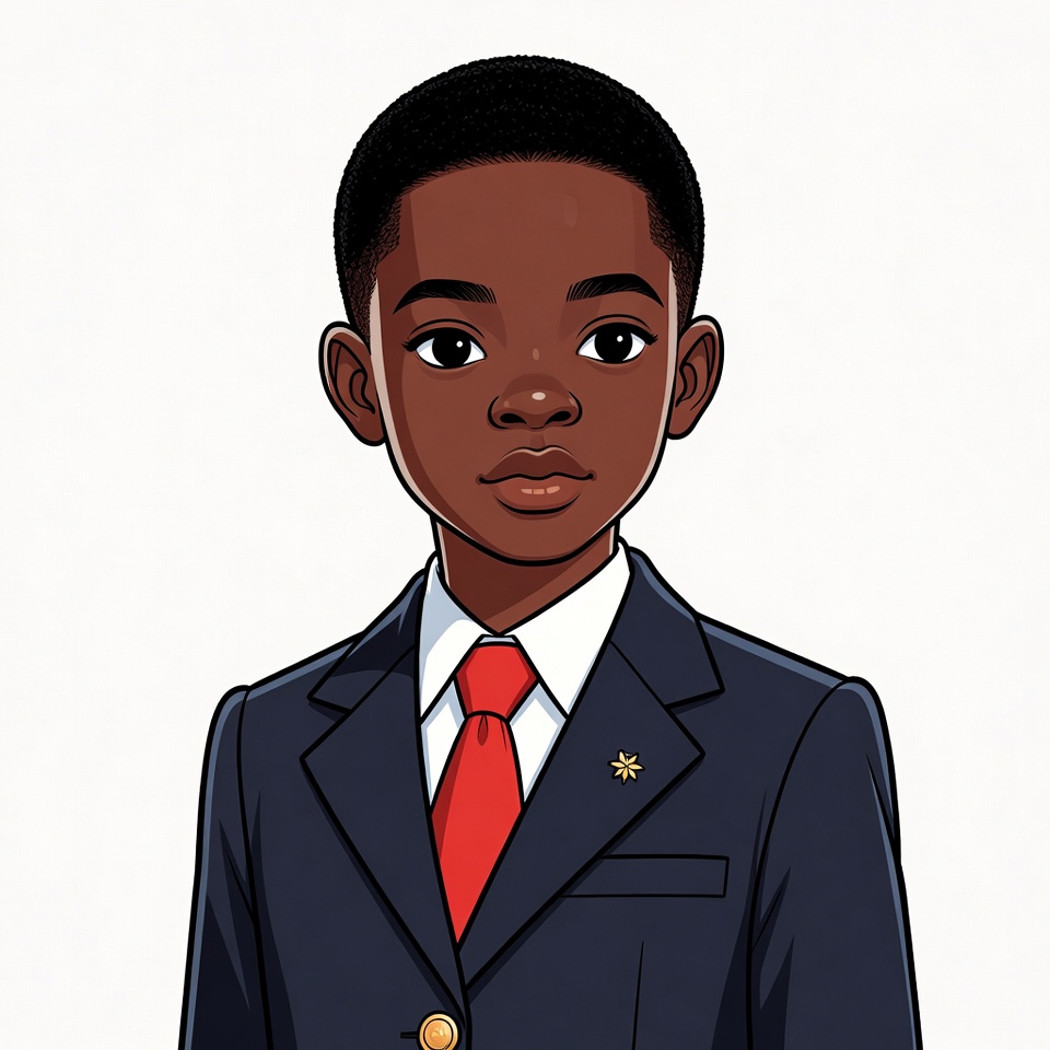 A cartoon illustration of a young African boy with short black hair and large expressive eyes faces forward on a white background. He wears a navy blue suit jacket with gold buttons, a white dress shirt, and a bright red tie. A small star-shaped pin adorns his lapel.