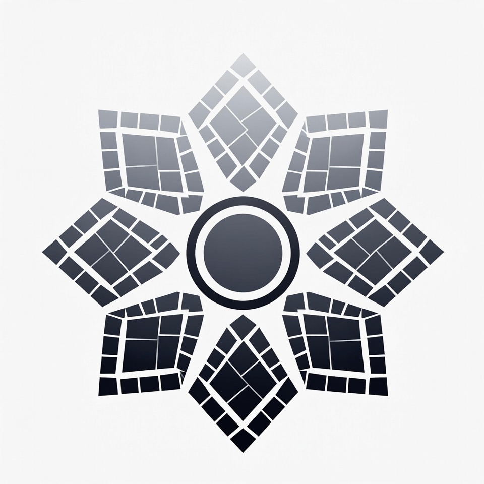 A geometric starburst design features eight diamond-shaped segments arranged around a central black circle. Each segment is composed of small gray mosaic tiles with gradient shading from light to dark. The entire illustration is set against a white background.