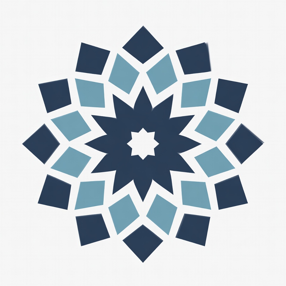 A symmetrical geometric mandala features a central starburst surrounded by layered diamond shapes. The design uses shades of navy blue and light blue on a white background. It has an intricate, radial pattern with pointed edges.