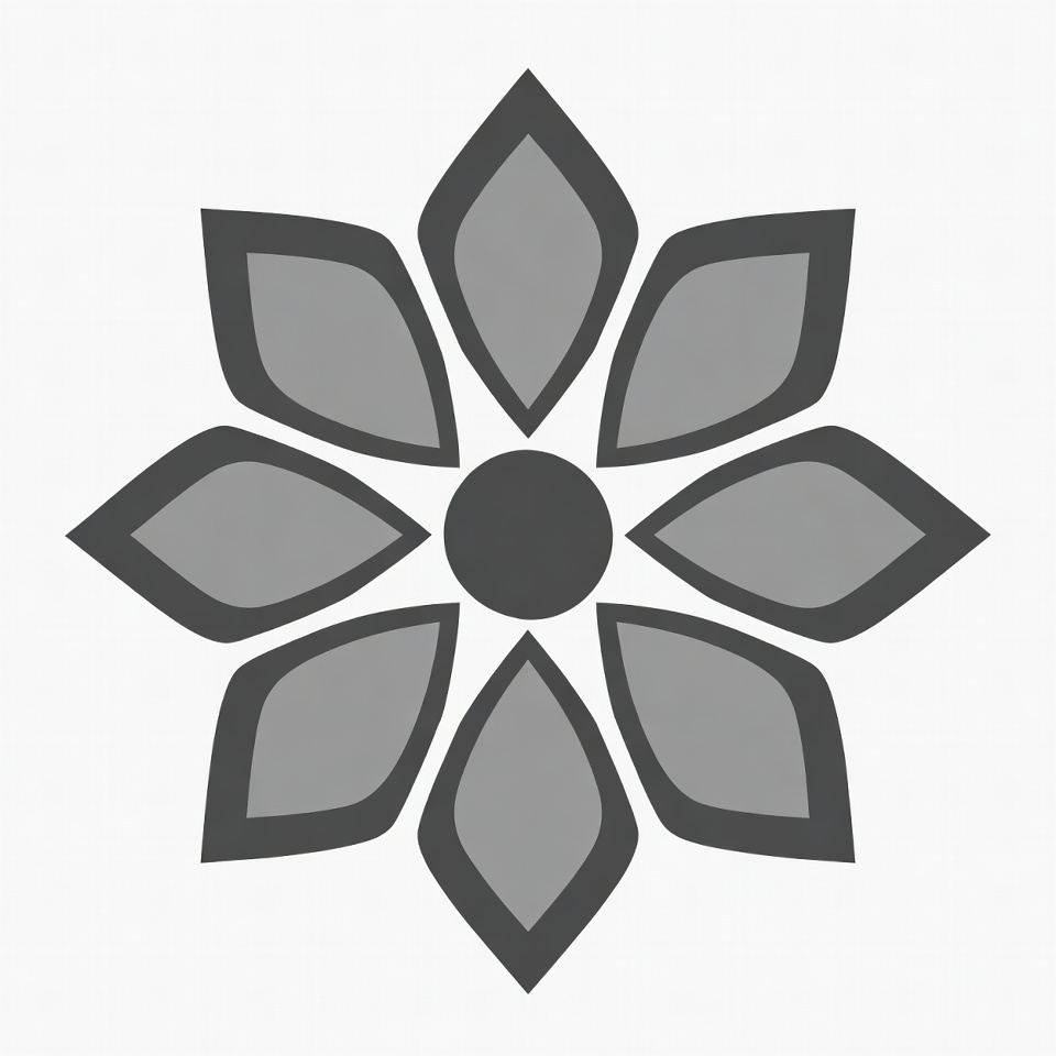 A simple gray flower illustration features eight pointed petals arranged symmetrically around a black center. The petals have dark gray outlines and lighter gray shading. It is isolated on a white background.