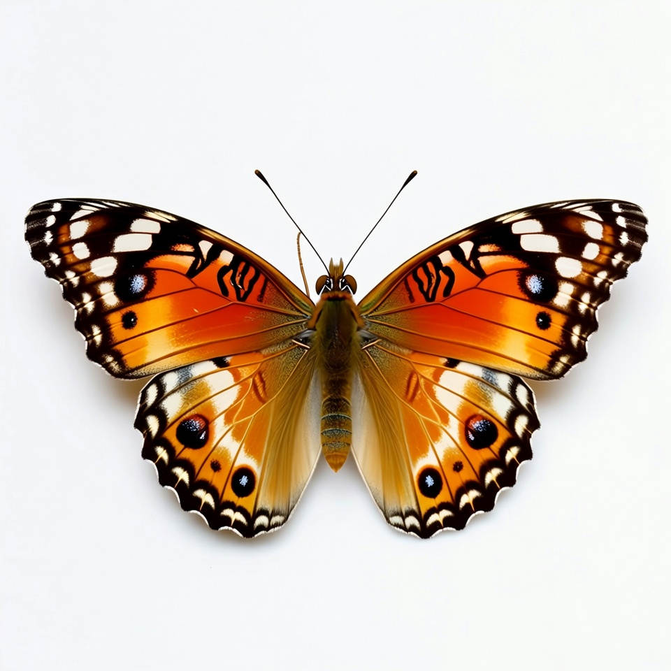 A vibrant orange butterfly with intricate black and white spotted wings is displayed against a plain white background. The wings feature bold orange hues, cream borders, and numerous black dots. Its body is brown with slender antennae extended outward.
