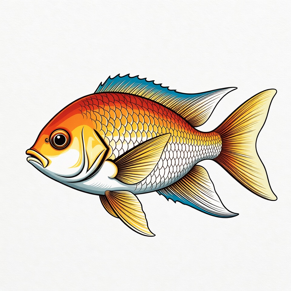 aquarium fish, big eyes, blue accents, colorful fish, detailed fish, fins, fish illustration, illustration, koi fish, marine life, orange fish, pet fish, scales, swimming fish, tropical fish, vector art, vibrant colors, white background, yellow fins, goldfish