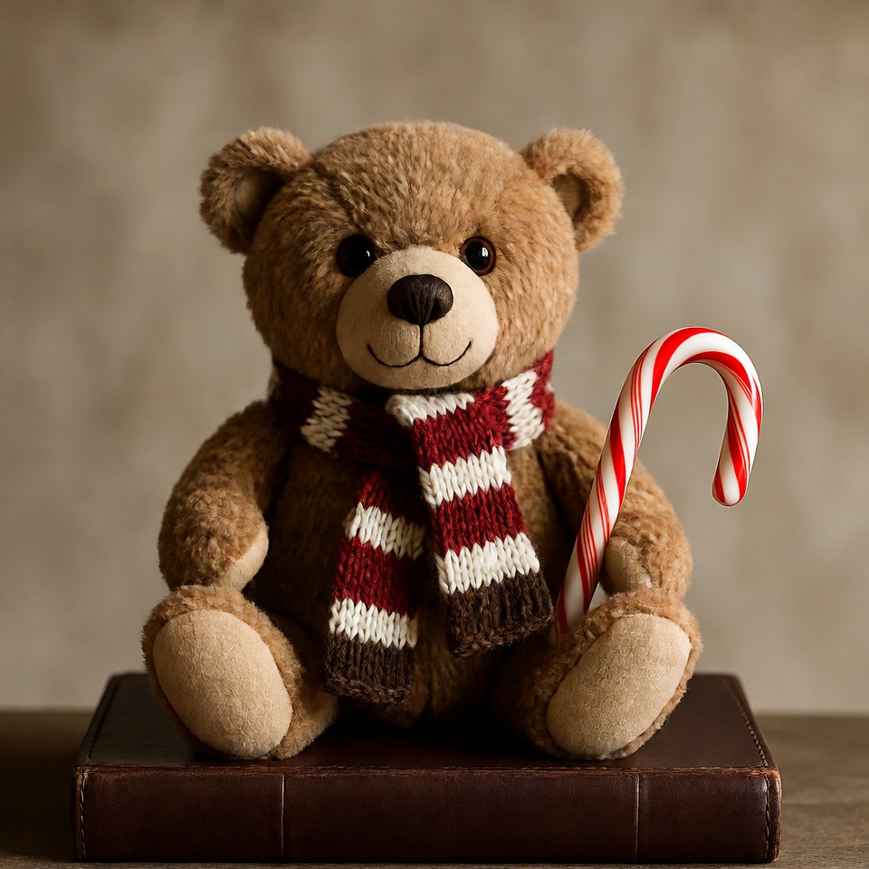 A cute brown teddy bear sits on a brown leather book. It wears a red and white striped scarf and holds a red and white candy cane. The bear has a smiling face and is posed against a beige background.