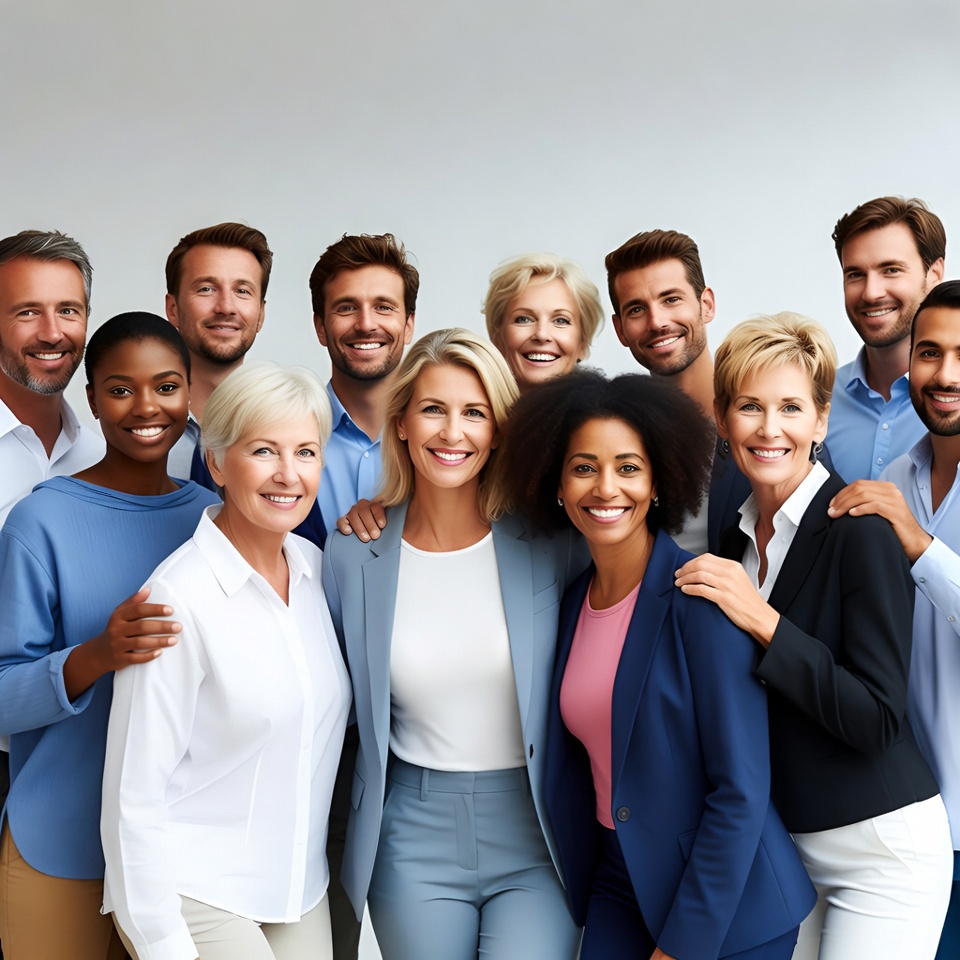 A large diverse group of men and women stands closely together in business attire against a plain gray background. They smile happily at the camera, with some placing arms around each other. The team includes White, African-American, Asian, and Middle Eastern professionals wearing suits, blouses, and shirts in various colors.