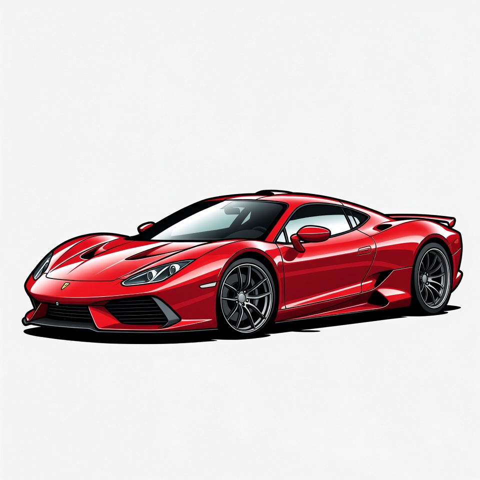 A vibrant red Ferrari supercar is depicted in a detailed digital illustration on a white background. The sleek coupe features aerodynamic curves, large black alloy wheels, tinted windows, and prominent front air intakes. It is angled to showcase its aggressive styling and glossy red paint.