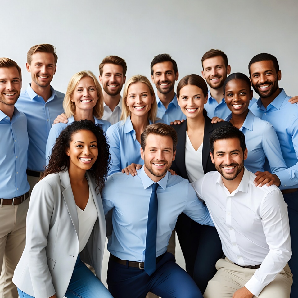 A large diverse group of men and women in business attire stands closely together smiling at the camera. They wear mostly blue shirts with some in blazers and ties, posing on a plain white background. The team includes White, African-American, and Latino professionals with arms around each other.