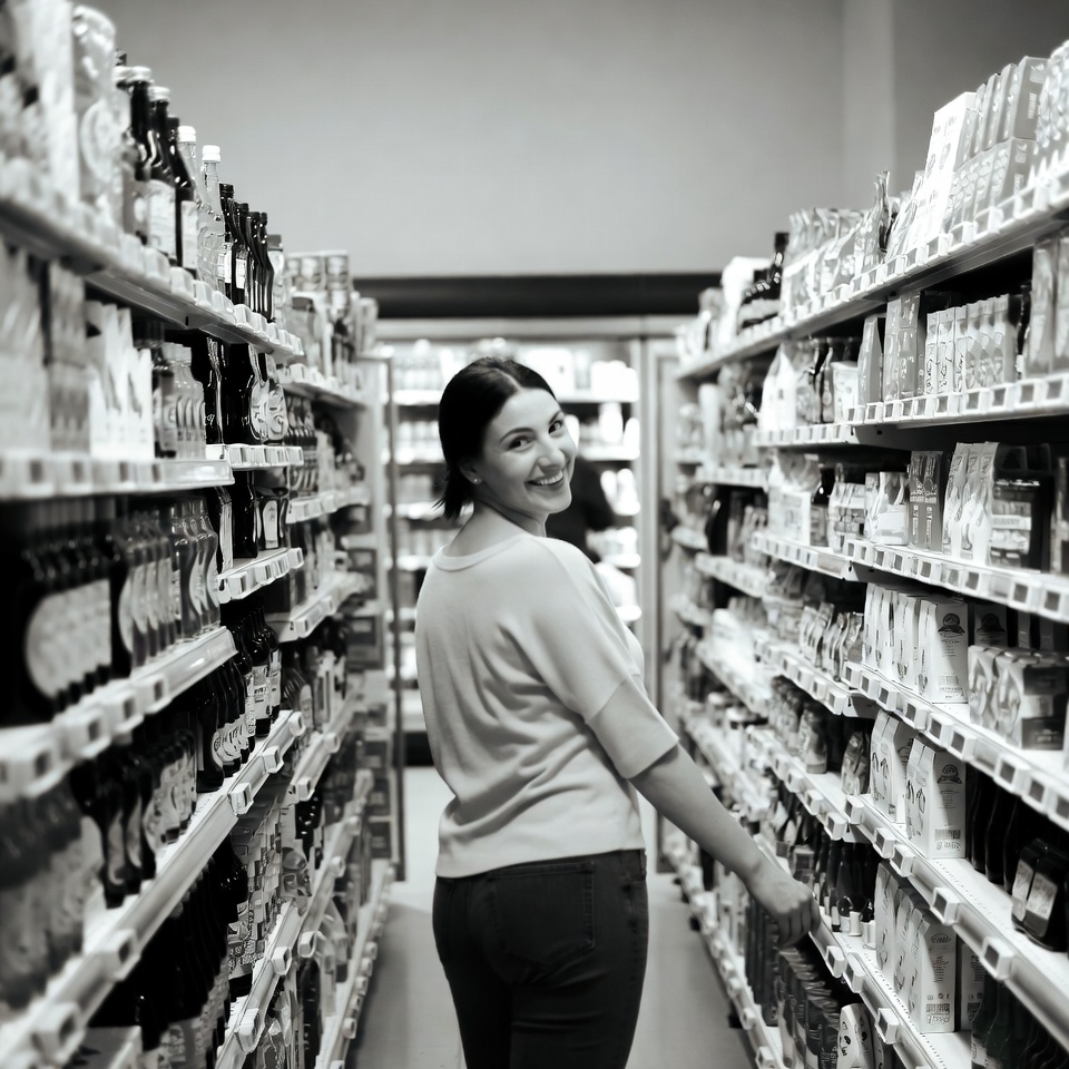 A woman with dark hair stands in a grocery store aisle lined with shelves of bottles, boxes, and packaged goods. She wears a light sweater and dark pants, reaching toward products on the shelf while smiling over her shoulder. The image is in black and white, capturing the well-stocked supermarket environment.
