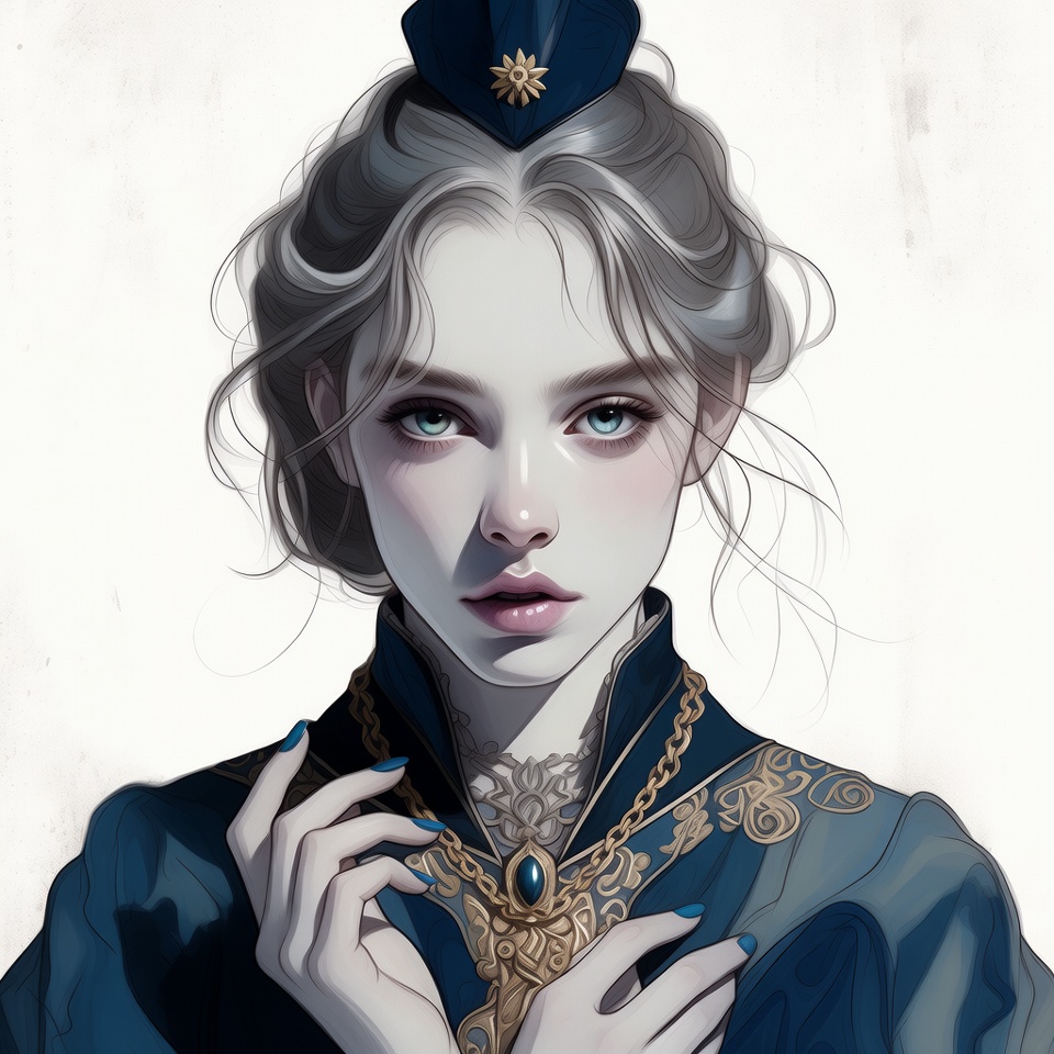 blue gem necklace, digital art, elegant, female, gold embroidery, green eyes, hands clasped, illustration, military hat, navy uniform, ornate collar, pale skin, portrait, silver hair, updo hairstyle, white background, woman