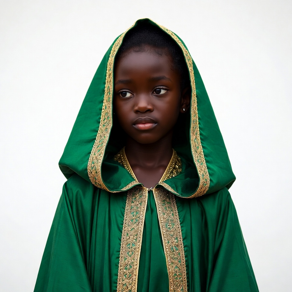 A young African girl with dark skin and expressive eyes stands against a white background. She wears a vibrant green hooded robe with intricate gold embroidery along the edges and hood. Her hood is up, framing her face, and she has a neutral expression.