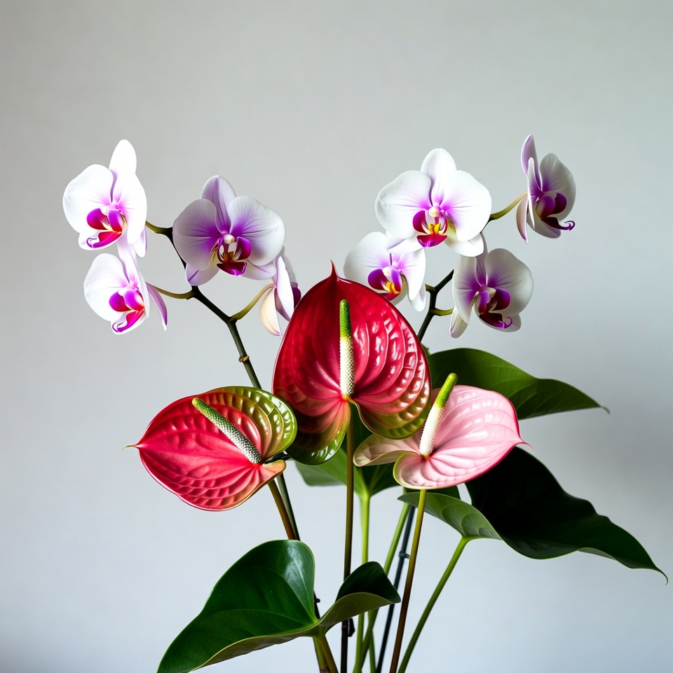 blooming flowers, bouquet, floral arrangement, flower cluster, flowers, green leaves, isolated background, orchids, pink anthurium, plant stems, purple orchids, red anthurium, tropical flowers, white orchids, anthurium