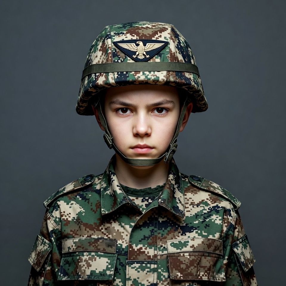 A young boy with short hair wears a camouflage helmet featuring an eagle emblem and stares directly at the camera with a serious expression. He is dressed in a matching camouflage military uniform with rolled-up sleeves. The image is set against a plain gray background.