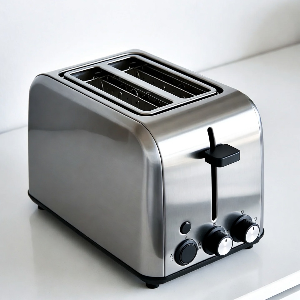 appliance, bread toaster, control knobs, cooking appliance, countertop toaster, empty slots, kitchen appliance, kitchen counter, modern toaster, silver toaster, stainless steel, toaster lever, two-slice toaster, white counter, toaster