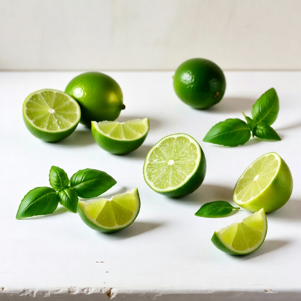 basil leaves, basil sprigs, citrus fruit, culinary photo, cut limes, food photography, fresh basil, fresh limes, fruit arrangement, green herbs, green limes, herb garnish, isolated, kitchen ingredients, lime display, lime halves, lime slices, lime wedges, top view, tropical fruit, vibrant green, white background, whole limes, limes